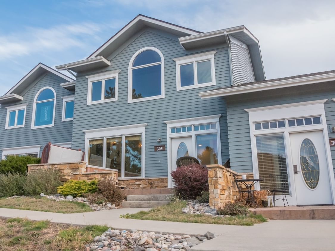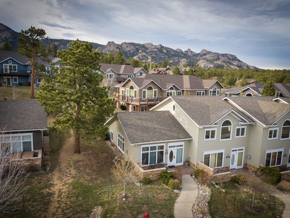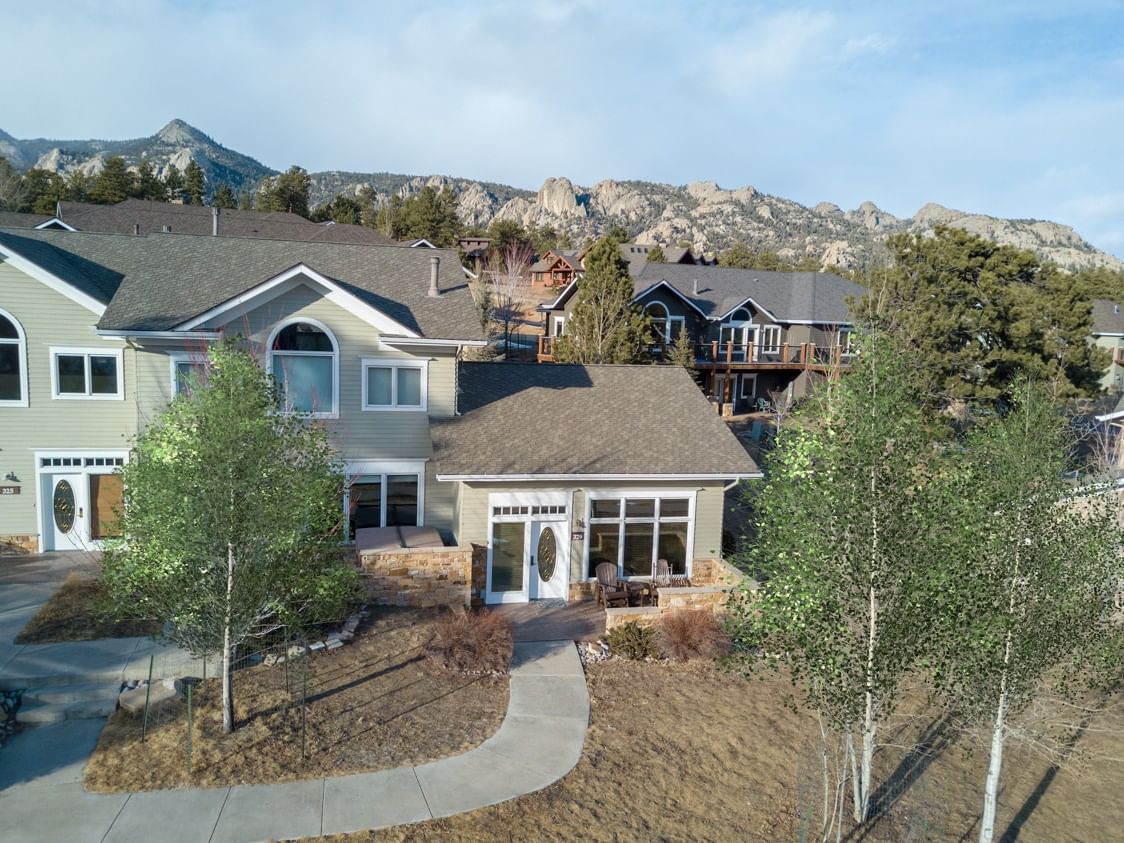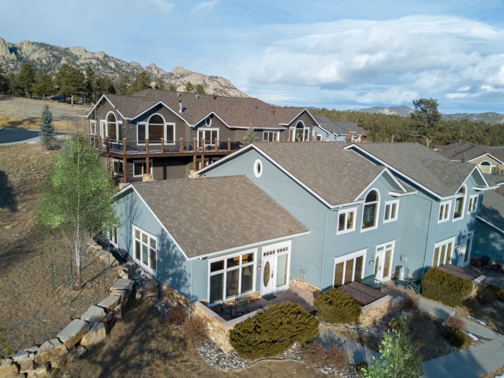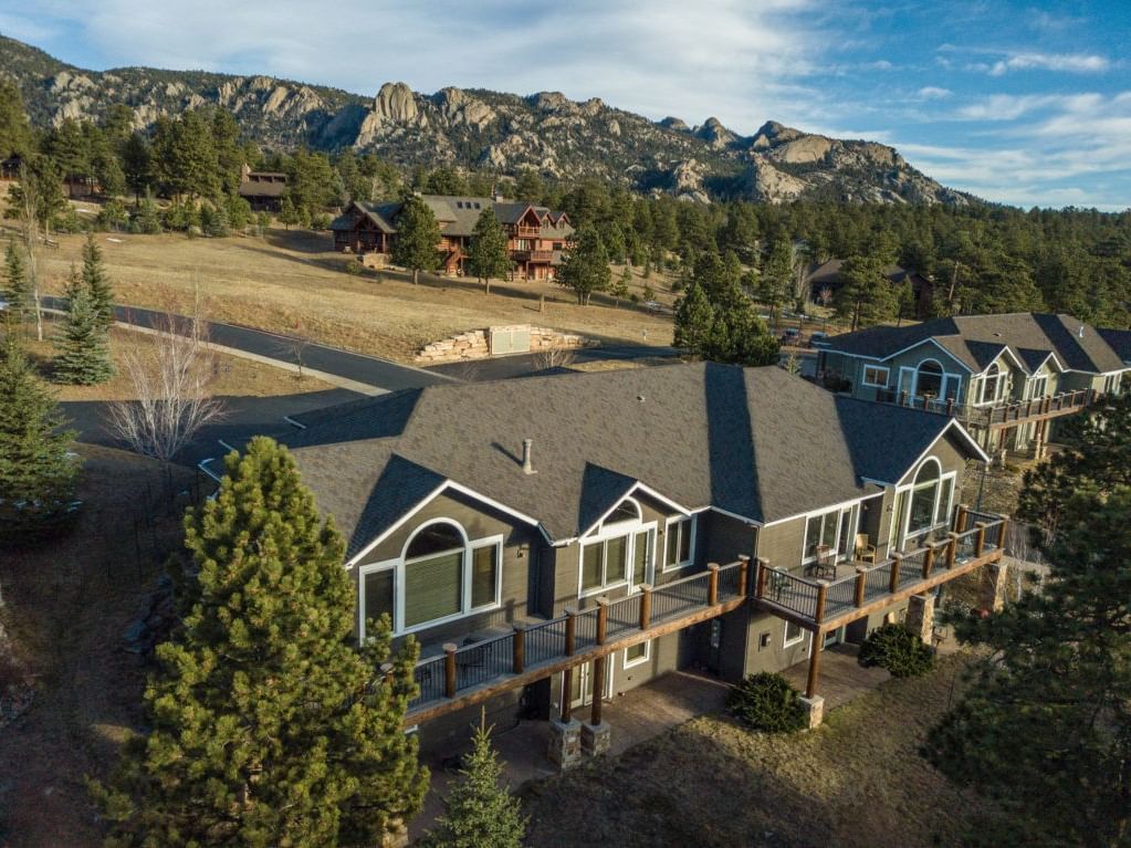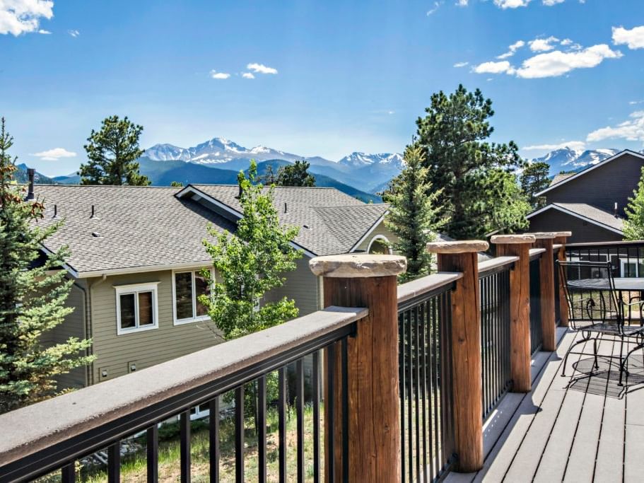 This spacious, mountain-chic condo features vaulted ceilings, modern décor, and an outdoor hot tub with spectacular views of Rocky Mountain National Park and the Stanley Hotel.