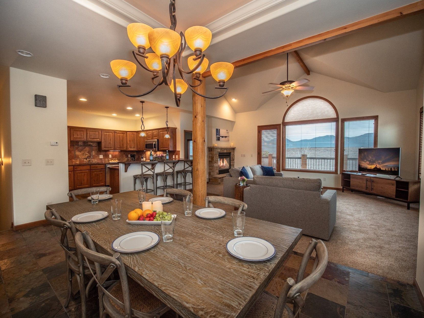 Adorned with classic, vintage décor, this condo is complete with an open kitchen, dining area, cozy family room, and private outdoor hot tub. The downstairs great room is elegantly furnished with brass and wood.