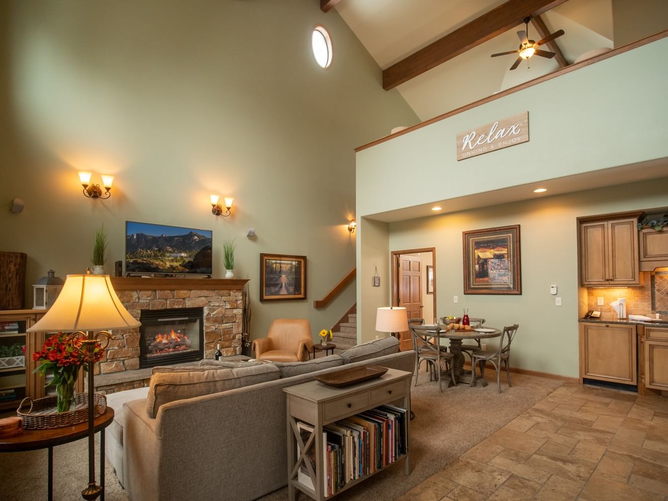 Featuring classic mountain décor, this spacious condo is elegantly furnished and complete with a modern kitchen, dining area, and cozy fireplace seating. The king master bedroom has a Jacuzzi en suite, and the lofted king bedroom has an en-suite bathroom and shower. Located just behind the Concert Hall, this condo has convenient access to the main hotel.